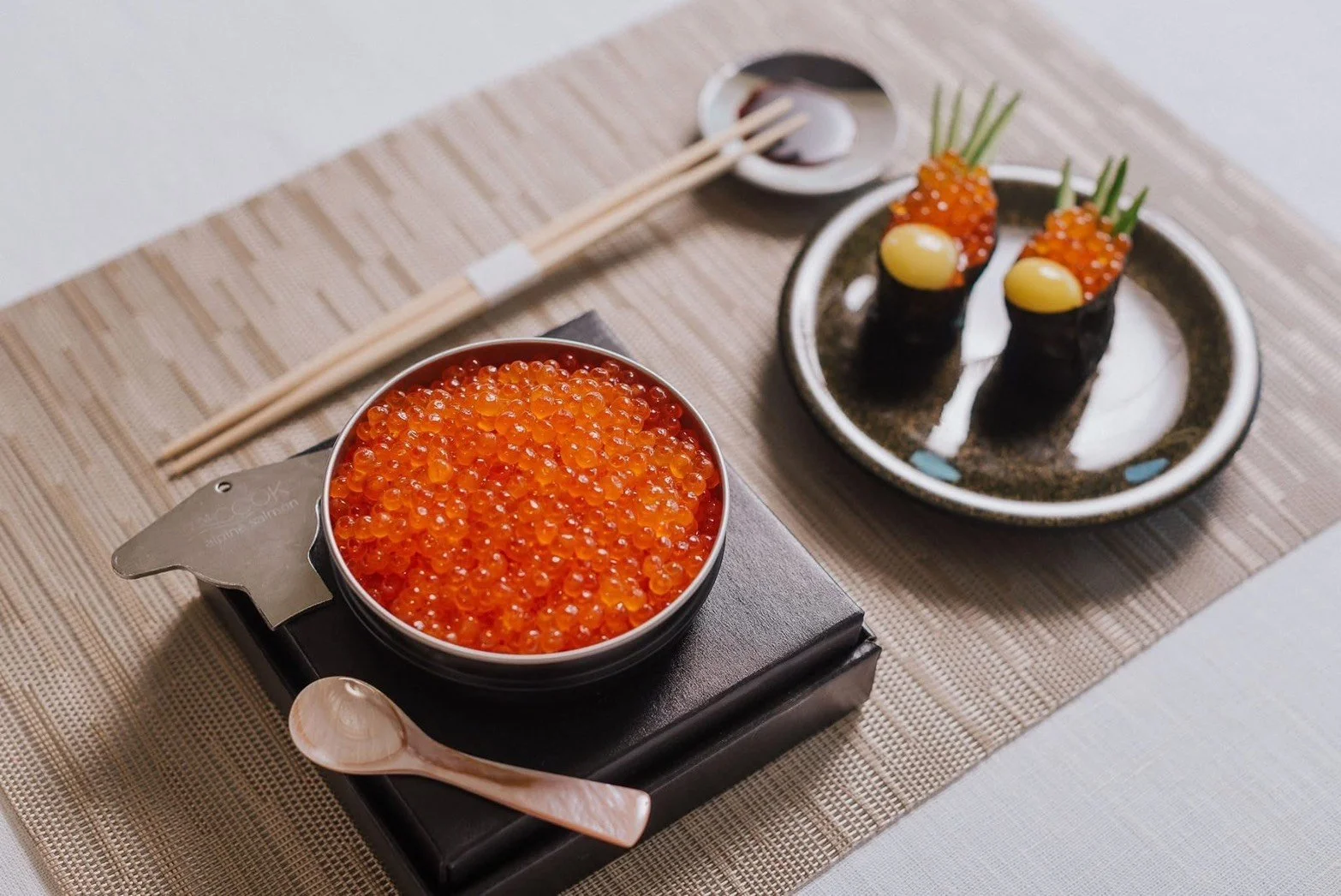 只有最新鮮最純淨的帝王鮭魚子才能用‘薄鹽技法-Malossol’來做調味,也才能吃出最它原始純淨的味道(Original) ; 另有純日本風味-Ikura,滿滿的魚子香氣與日本清酒、味醂搭配的天衣無縫。